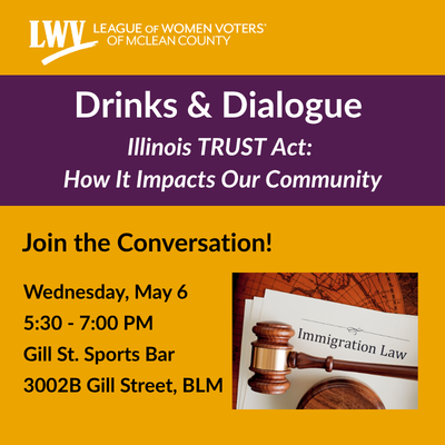 Come to the May 6th Drinks and Dialogue where Bloomington Police Chief Jamal Simington will be sharing information about the Illinois Trust Act and how it is implemented by the Bloomington Police Department.